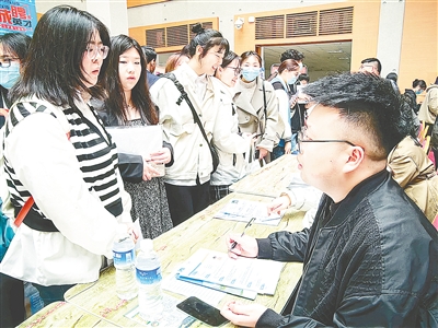招聘單位代表與畢業(yè)生現(xiàn)場交流互動(dòng)。