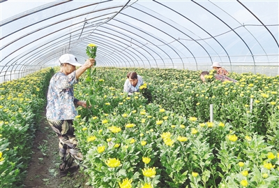 “干一天能掙60塊錢,比出門打工方便多了。旺季忙起來還有額外的加班費!”幾名五六十歲的阿姨在大棚內(nèi)熟練地采摘著菊花。