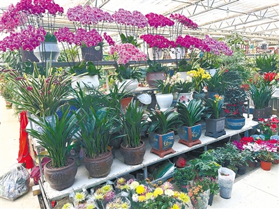 隨后,記者到柳江路金三角花卉市場采訪。市場內(nèi),蝴蝶蘭、發(fā)財(cái)樹、長壽花等顏色明艷、寓意吉祥的花卉被擺在顯眼位置。人們?nèi)宄扇海诨ɑ芫G植間穿梭、選購。除了鮮花、綠植,一些做工精美、寓意美好的仿真花卉和用仿真花飾做成的福桶也很受歡迎。“福桶是最近幾年興起的,以紅色為主基調(diào),非常喜慶,適合春節(jié)擺在家中,深受消費(fèi)者喜愛。”店主駱先生介紹。