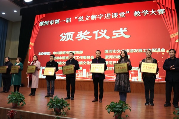 11月29日,由中共漯河市委宣傳部、漯河市文化旅游發(fā)展工作促進(jìn)會(huì),漯河市語言文字工作委員會(huì),漯河市教育局、河南省文字學(xué)會(huì)許慎文化研究會(huì)、漯河市日報(bào)社聯(lián)合舉辦的漯河市第一屆“說文解字進(jìn)課堂”教學(xué)大賽總決賽及頒獎(jiǎng)典禮在漯河市郾城中學(xué)舉行。郾城中學(xué)東校區(qū)教師常賽男獲得“說文解字進(jìn)課堂”教學(xué)大賽初中組一等獎(jiǎng),郾城區(qū)實(shí)驗(yàn)小學(xué)曹艷紅獲得“說文解字進(jìn)課堂”教學(xué)大賽小學(xué)組一等獎(jiǎng),郾城區(qū)教育局、郾城中學(xué)均獲得“說文解字進(jìn)課堂”教學(xué)大賽優(yōu)秀組織獎(jiǎng)
