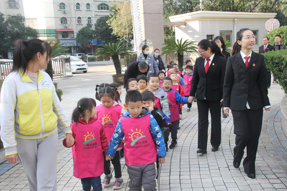 (中院法官和陽(yáng)光雨露幼兒園小朋友在大樓門前留影)