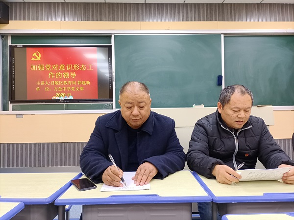 為加強黨對意識形態(tài)工作的領(lǐng)導(dǎo),穩(wěn)固基層黨員教師的意識形態(tài)工作,11月30日下午,召陵區(qū)教育局韓建新同志,在萬金中學(xué)東校區(qū),給萬金鎮(zhèn)全體黨員教師上了《加強和改進(jìn)黨對意識形態(tài)工作的領(lǐng)導(dǎo)》的思政課,此次會議由萬金中學(xué)黨支部副書記張曉斌同志主持。