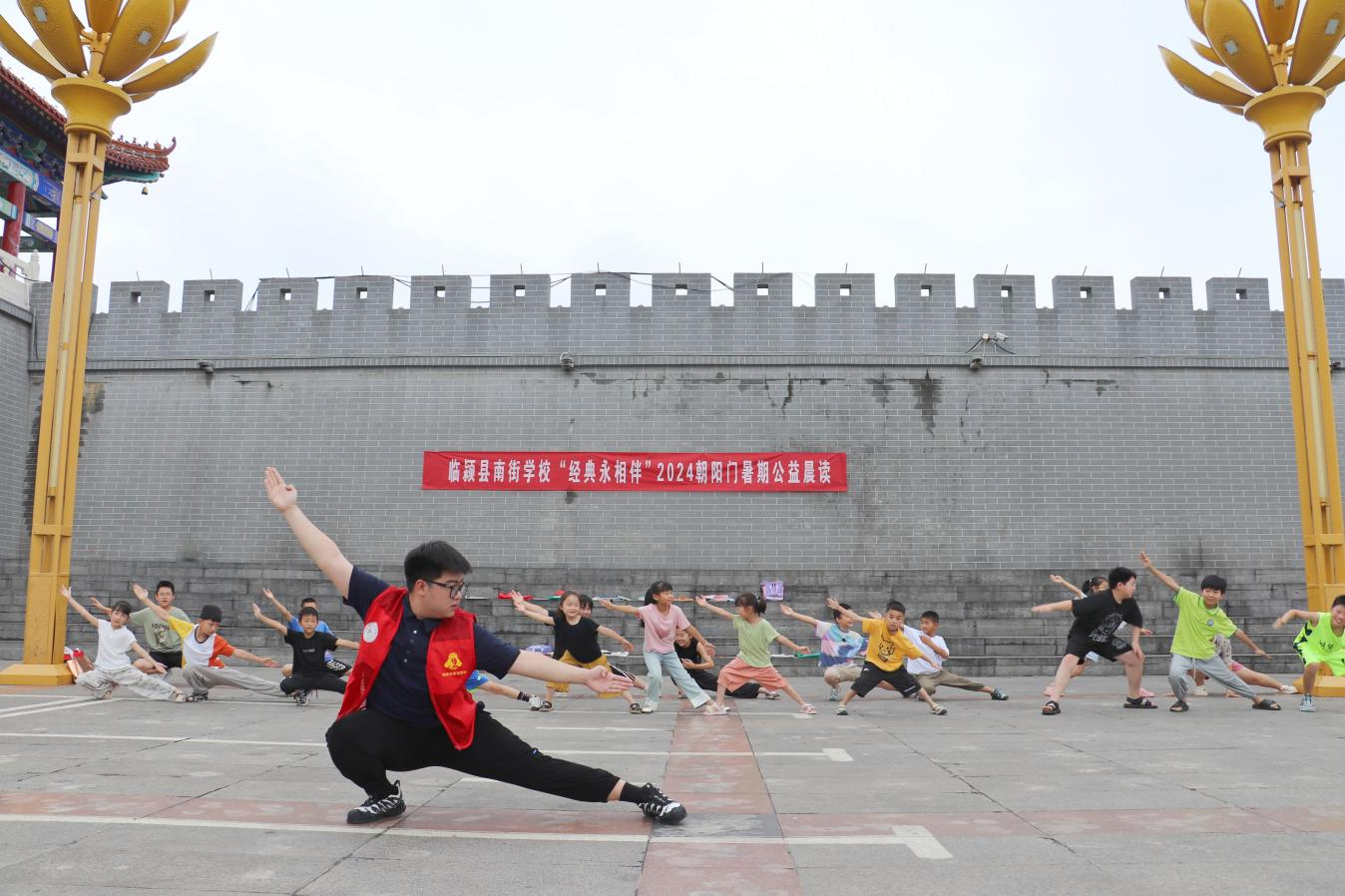 “沖拳!一,哈!二,哈!……”清晨,在漯河市臨潁縣南街村朝陽門廣場激蕩著響亮的口號聲,這聲音整齊劃一、鏗鏘有力,伴隨著氣勢十足的聲音,只見孩子們做出馬步、穿掌、沖拳、踢腿等經(jīng)典的武術(shù)招式,動作有力,虎虎生風(fēng)。