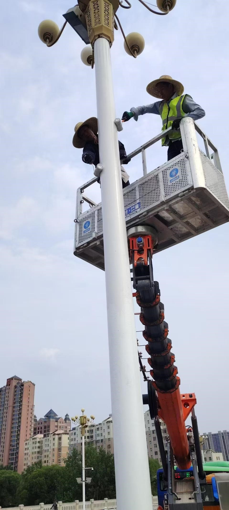 針對橋梁燈桿位于河道之上,和環(huán)境潮濕的特點,此次燈桿刷漆特別選用丙烯酸聚氨酯面漆,使其抗氧化耐腐蝕,耐候性更強(qiáng)。在施工中,工作人員使用高空作業(yè)車升空至10余米高度操作,在全面做好安全措施的基礎(chǔ)上,盡量減少對市民出行的影響,采取早上和傍晚作業(yè)的方式,在適宜油漆作業(yè)的溫度進(jìn)行刷漆作業(yè),期間市政人員不畏高空、風(fēng)大等因素,在盡量保護(hù)原鍍鋅膜的基礎(chǔ)上,先對脫漆銹蝕部位進(jìn)行清理,再對燈桿進(jìn)行打磨除塵,著重對銹點部位涂刷防銹漆后再對整桿燈桿進(jìn)行刷漆。