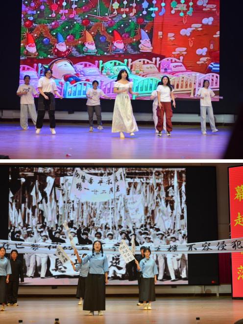 當天演出在漯彎春韻的舞蹈中拉開帷幕,從《寶玉大婚》《西安事變》《白雪公主和丫鬟們》《破曉》等經(jīng)典劇目的深度改編,到聚焦校園生活、社會熱點的劇本《再看五分鐘》《當考試還剩15分鐘》《誰逼瘋了周日》《回不去的十七歲》等,同學(xué)們以敏銳的觀察力捕捉生活細節(jié),用戲劇語言傳遞青春思考。高一(13)班的《破曉.她時代》通過講述一群率先覺醒的女大學(xué)生,沖破了舊思想的牢籠,以青春和熱血,為自由和平等而吶喊;高一(15)班高一(16)班的《文字彼岸的他們》通過時空交錯的敘事,講述了三代女性的讀書世界,倡導(dǎo)讀書的重要性。高一(9)班的《金陵十三釵》則以極具現(xiàn)代感的舞美設(shè)計和沉浸式表演,賦予傳統(tǒng)故事新的生命力。高一(3)班高一(4)班《回不去的17歲》以兩代人的真實經(jīng)歷改編,引發(fā)學(xué)生對青春,責任和奉獻的思索,引發(fā)了陣陣掌聲。