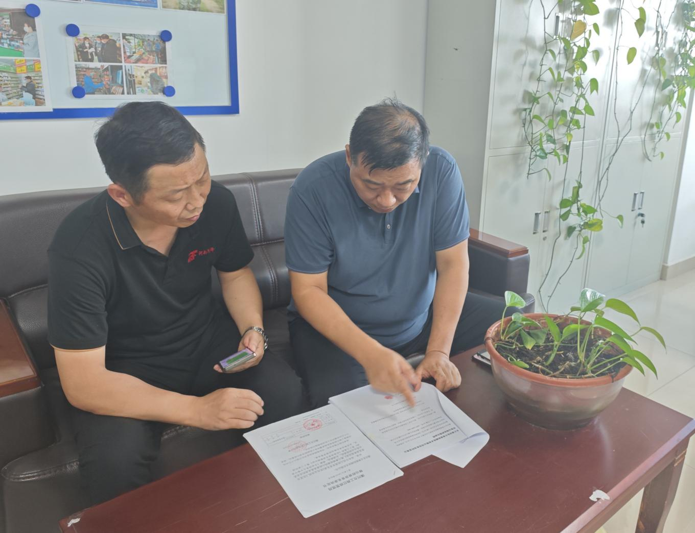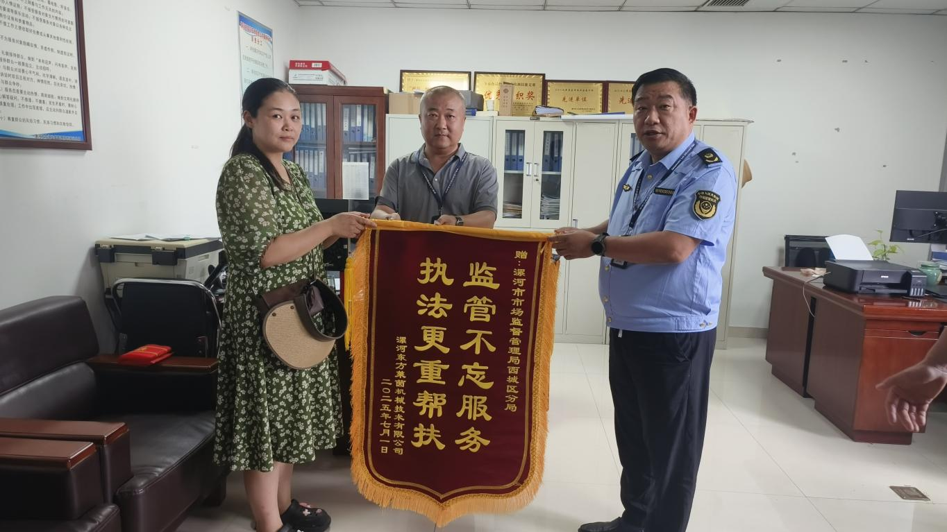 2025年7月7日下午,一名企業(yè)工作人員將一面繡著“監(jiān)管不忘服務、執(zhí)法更重幫扶”的錦旗送到漯河市市場監(jiān)督管理局西城區(qū)分局執(zhí)法人員手中,以表達對該局執(zhí)法人員幫扶企業(yè)的感謝之情。