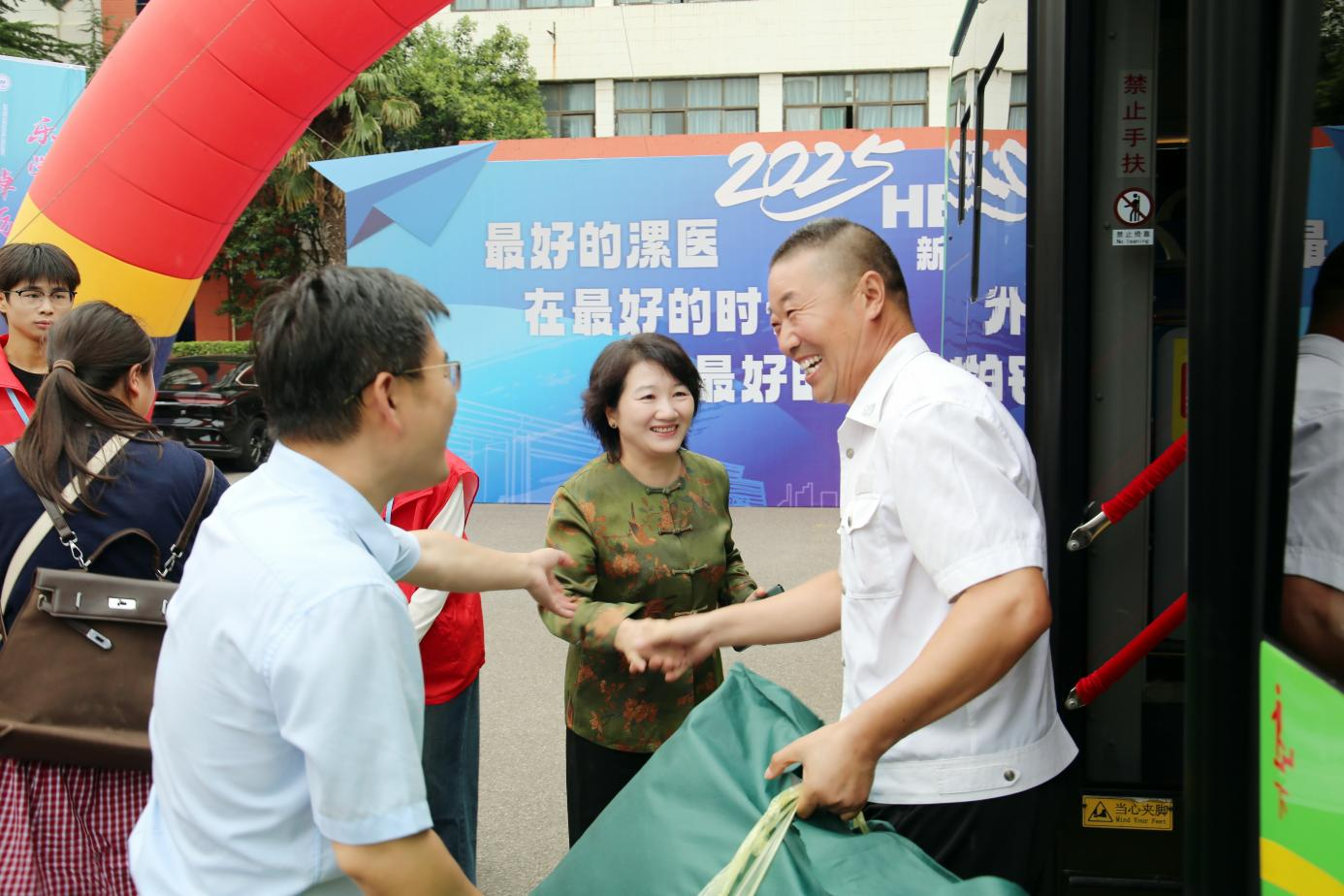 青春乘秋風,壯志啟新程。8月30日,漯河醫(yī)專迎新工作全面拉開帷幕,上午8時,校長張祎捷、校黨委副書記邊曉峰分別帶領(lǐng)校領(lǐng)導班子深入源匯校區(qū)、召陵校區(qū)迎新現(xiàn)場,迎接第一輛駛?cè)胄@的新生班車,親切看望2025級新生及家長,并慰問一線工作人員和志愿者。