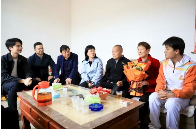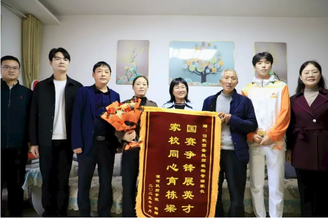抵達選手家中后,院領導首先向家長和選手遞上紅彤彤的錦旗與沉甸甸的慰問品,“孩子能站上全國賽場拿獎牌,離不開家里的支持,也離不開學校的培養(yǎng),這是咱們共同的驕傲!”一句真摯祝賀,瞬間拉近了家校距離。