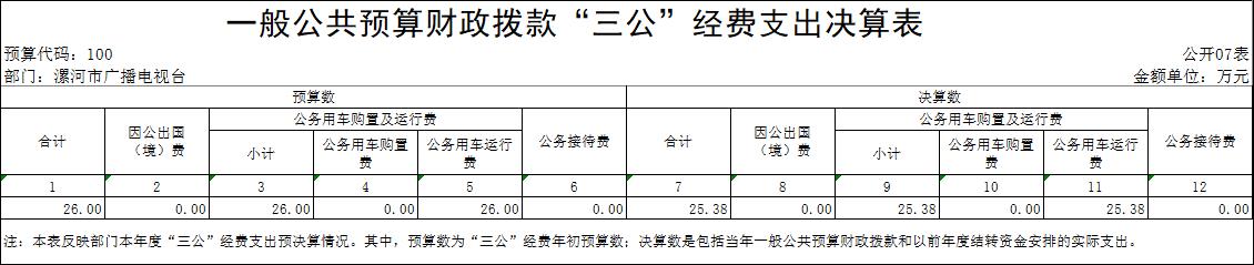2020年度“三公”經(jīng)費財政撥款支出決算中,因公出國(境)費支出決算0萬元;公務(wù)用車購置及運行費支出決算25.38萬元,完成預(yù)算的97.62%,占100.0%;公務(wù)接待費支出決算0.00萬元。具體情況如下: