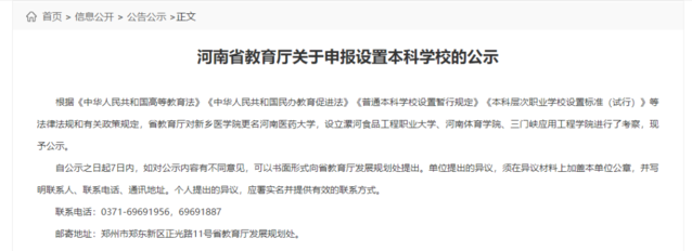 剛剛,河南省教育廳發(fā)布關(guān)于申報設(shè)置本科學(xué)校的公示,其中提到,省教育廳對