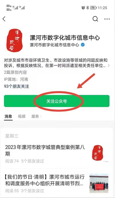 在微信搜索欄中搜索“漯河市數(shù)字化城市信息中心”或通過(guò)掃描二維碼關(guān)注公眾號(hào)。關(guān)注微信公眾號(hào)后,首先打開(kāi)手機(jī)GPS定位功能。