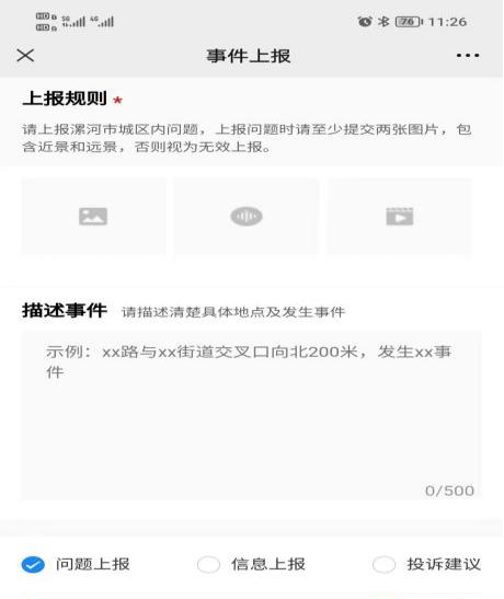 根據(jù)上報(bào)規(guī)則上報(bào)發(fā)現(xiàn)問(wèn)題,可以選擇使用圖片(至少上傳兩張圖片,分別包含遠(yuǎn)景和近景)或視頻錄像等方式上傳問(wèn)題,在描述事件處需將所舉報(bào)問(wèn)題及具體道路位置描述清楚,再次確認(rèn)定位無(wú)誤,隨后點(diǎn)擊提交即完成上報(bào)。