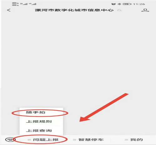 在公眾號(hào)主頁(yè)左下方點(diǎn)擊“問(wèn)題上報(bào)”專欄,然后選擇“隨手拍”欄,按照規(guī)則提示進(jìn)行操作。