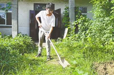 8月25日下午,記者走進(jìn)舞陽縣孟寨鎮(zhèn)龍東村王帥斌的家中。院內(nèi)有一條通向堂屋的碎磚路,其他地方種了些蔬菜,剩余地方都是荒草。三間房屋經(jīng)過危房改造,房頂加固了彩鋼瓦。18歲的王帥斌正手握鐵鍬,鏟除小路上的雜草。