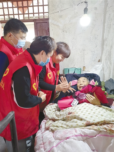 高慶賀家里條件一直不好,是漯河公益志愿者團隊關(guān)愛的對象。志愿者林紅蕊為老爺子送上鮮花,老人接過鮮花,躺在床上眉開眼笑,抱拳表示感謝(如圖)。