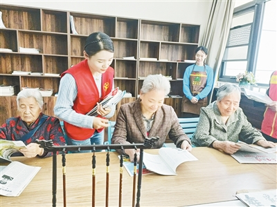老人們?cè)诟珊雨惤值谰C合養(yǎng)老服務(wù)中心讀書(shū)看報(bào)。