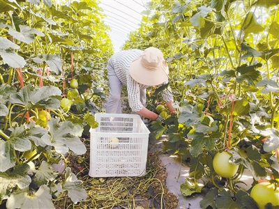 在甜瓜大棚,翠綠的甜瓜秧爬滿了架子,甜瓜個(gè)大體重、色澤誘人。“‘綠寶’甜瓜一上市就供不應(yīng)求。這幾天我們增加了人手,加快采摘、裝車,爭取讓市民早一點(diǎn)兒嘗‘鮮’。”工人薛鳳蘭看著眼前掛滿棚架的“綠寶”甜瓜高興地說,“綠寶”甜瓜與普通甜瓜相比,糖度高、肉質(zhì)細(xì)脆多汁、口感清甜爽口,且含有大量的維生素等。大棚內(nèi)除了種植有“綠寶”甜瓜外,還有“星甜22”甜瓜、美都西瓜、櫻桃番茄等。