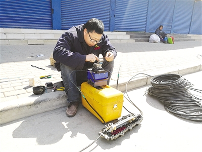 “可能是有大車經(jīng)過(guò)掛住線纜,導(dǎo)致線纜被拉長(zhǎng),最終垂落地上。”陳師傅邊熔纖,邊告訴記者。