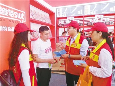 志愿者在食博會(huì)現(xiàn)場(chǎng)發(fā)放宣傳資料。