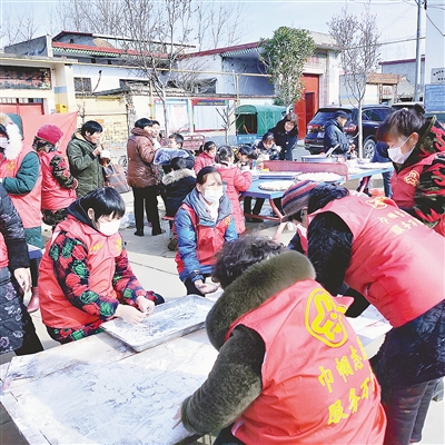 當(dāng)天一大早,45名巾幗志愿者帶著灶具、面粉、鮮肉、蔬菜等物品來(lái)到了陳東村村民廣場(chǎng)上。她們和面、剁餃子餡忙得熱火朝天。沒多久,一碗碗熱氣騰騰的餃子便出鍋了。隨后,志愿者們把餃子分發(fā)給到場(chǎng)的老人和孩子,還發(fā)放了年歷、對(duì)聯(lián)、紙抽等禮品,并為放學(xué)歸來(lái)的兒童送上一個(gè)個(gè)精美的書包。