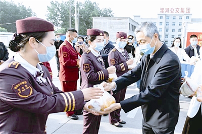 “情系公交司機(jī)”愛心早餐工程啟動儀式上,市人大常委會副主任、市總工會主席陳平為公交司機(jī)發(fā)早餐。