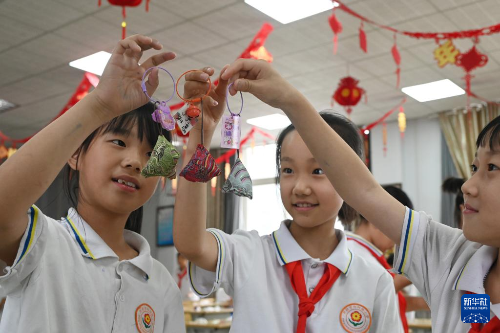 6月5日,河南省開封市向陽路小學的學生展示自己制作的香囊。