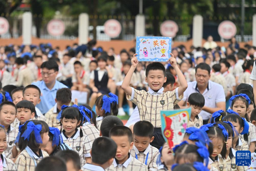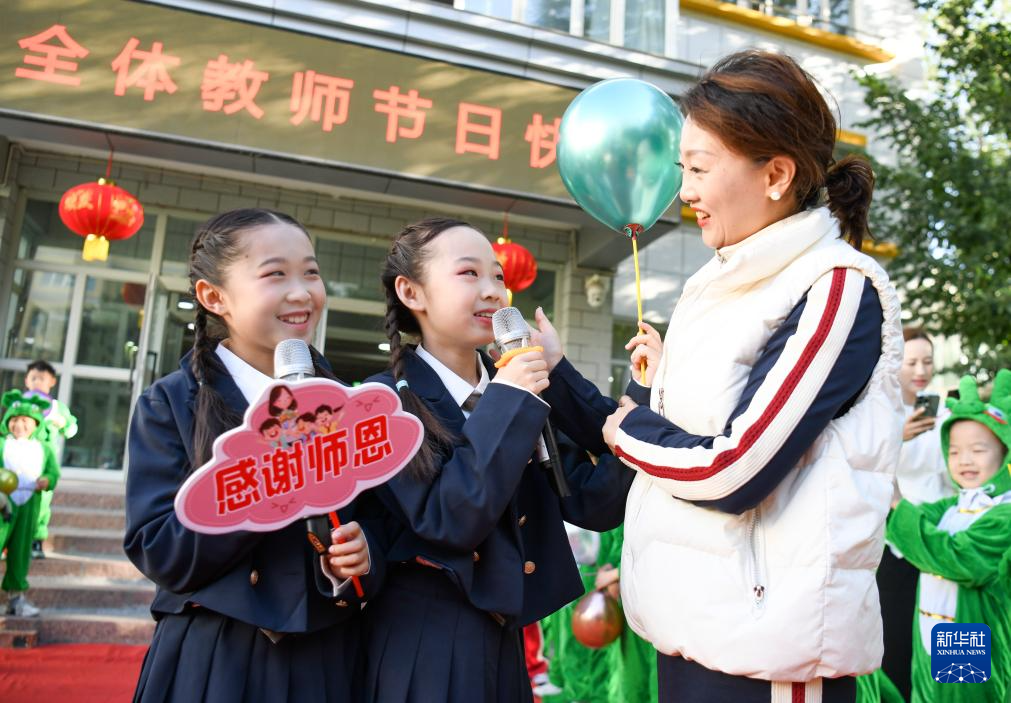 9月10日,在新疆教育學(xué)院實(shí)驗(yàn)小學(xué)校園,學(xué)生為老師獻(xiàn)歌送上祝福。