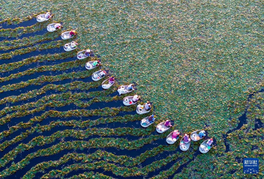 10月4日,農(nóng)民在江蘇省泰州市海陵區(qū)蘇陳鎮(zhèn)張家院社區(qū)菱塘里采摘菱角(無人機照片)。