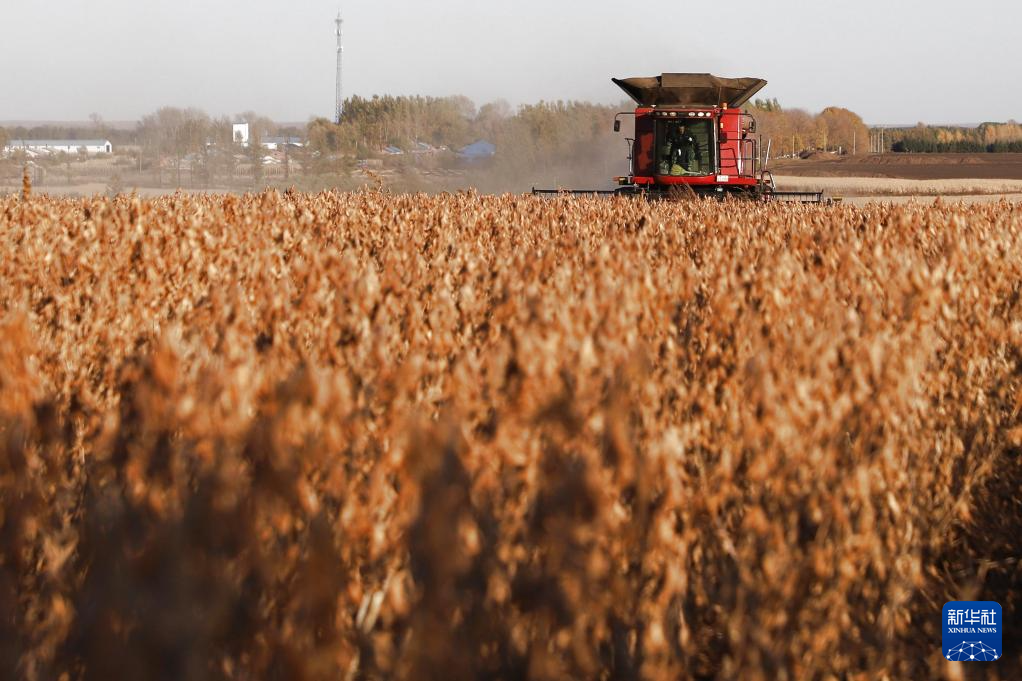 10月3日,在北大荒集團黑龍江紅星農(nóng)場有限公司第四管理區(qū)有機大豆種植基地,大型收割機在進行收獲作業(yè)。