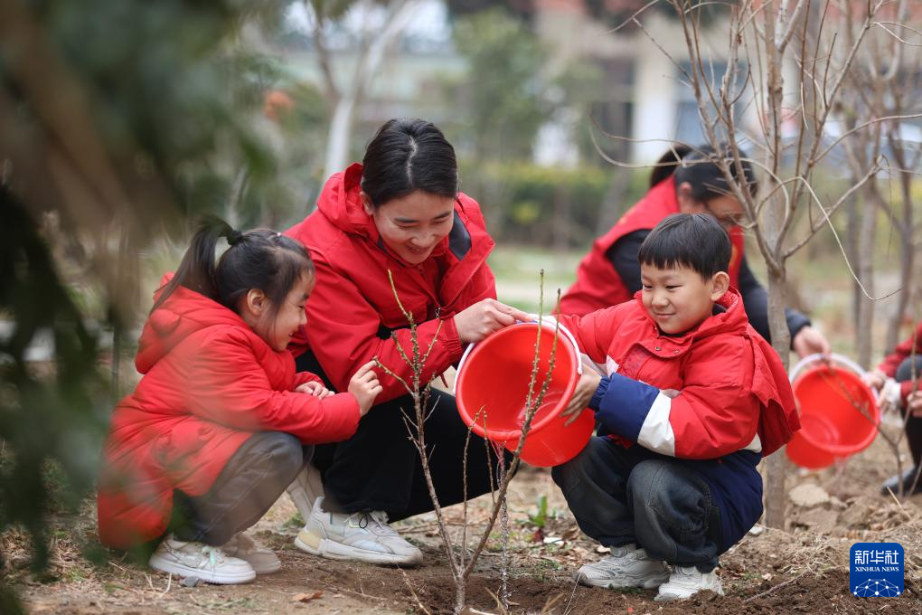 3月11日,小學(xué)生在河南省商丘市夏邑縣育才學(xué)校教育實(shí)踐基地參加義務(wù)植樹護(hù)樹活動(dòng)。