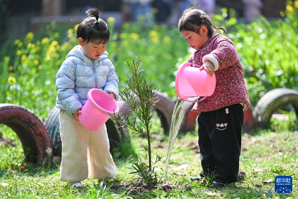 3月11日,江蘇省南京市建鄴區(qū)金地名京幼兒園的孩子們?cè)谛@里為樹苗澆水。