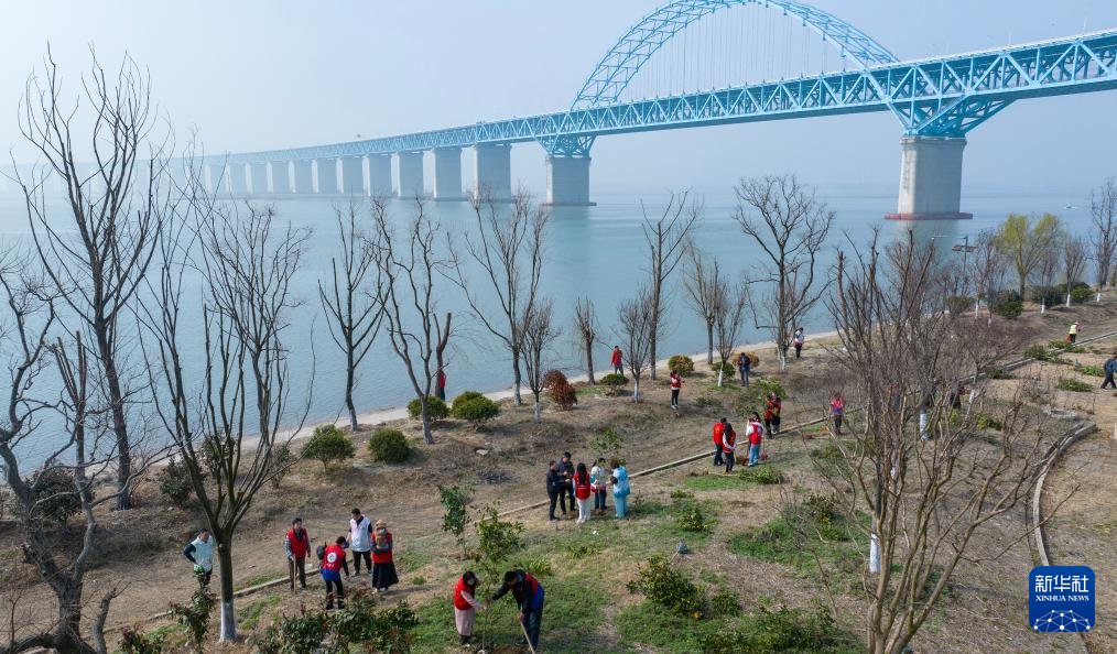 3月11日,在江蘇省南通市通州區(qū)平潮鎮(zhèn),志愿者在長江岸邊植樹(無人機(jī)照片)。