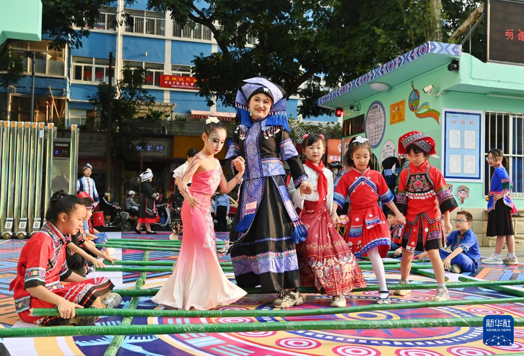 3月27日,老師和孩子們?cè)趶V西南寧市民族大道東段小學(xué)跳竹竿舞。