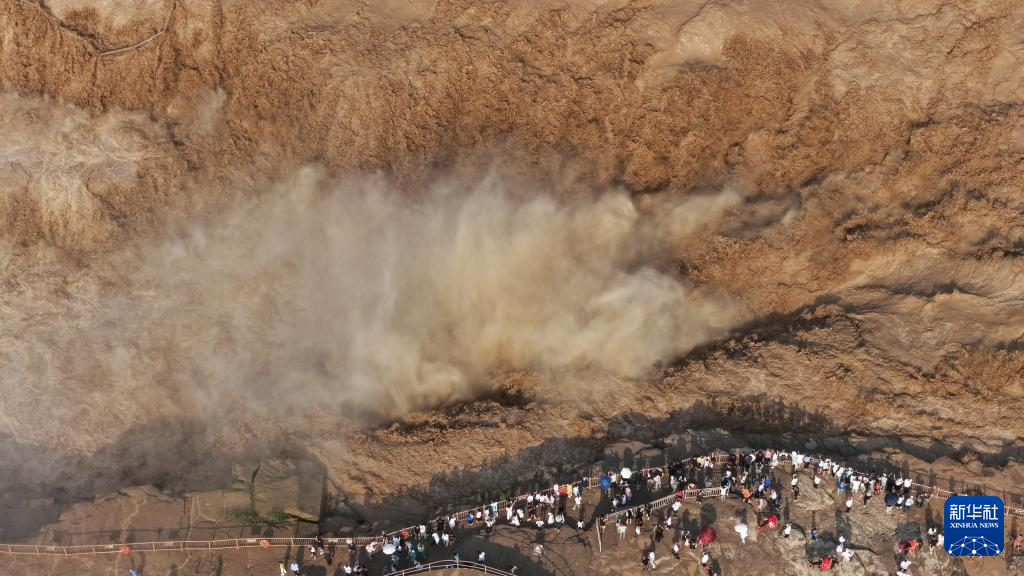 7月27日,人們在山西吉縣觀看黃河壺口瀑布(無人機照片)。