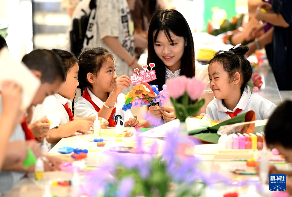 9月9日,在河北省石家莊市柏林莊學(xué)校開展的“黏土做花寄師恩”主題活動(dòng)中,孩子們用粘土制作花束,為老師送上節(jié)日的祝福。