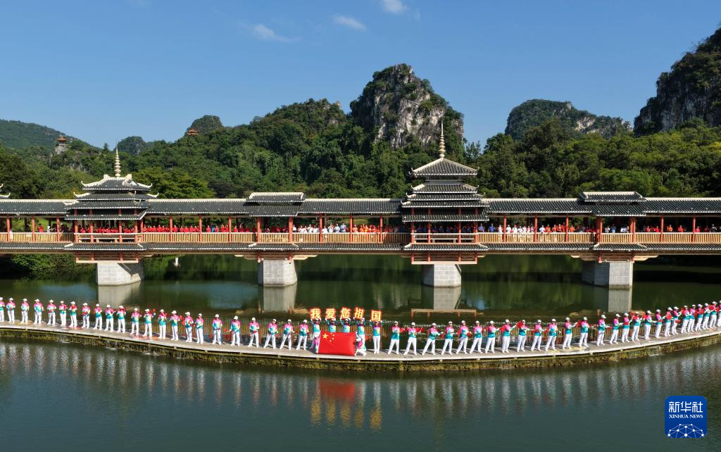 9月28日,在廣西柳州市龍?zhí)豆珗@,人們共同唱響《我和我的祖國》(無人機(jī)照片)。