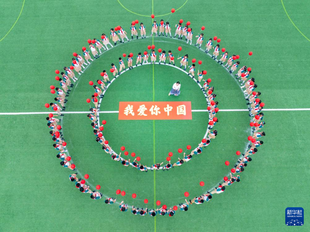 9月28日,江蘇省泰州市姜堰區(qū)東橋小學(xué)教育集團(tuán)東板橋校區(qū)學(xué)生學(xué)唱愛國歌曲,迎接國慶節(jié)(無人機(jī)照片)。