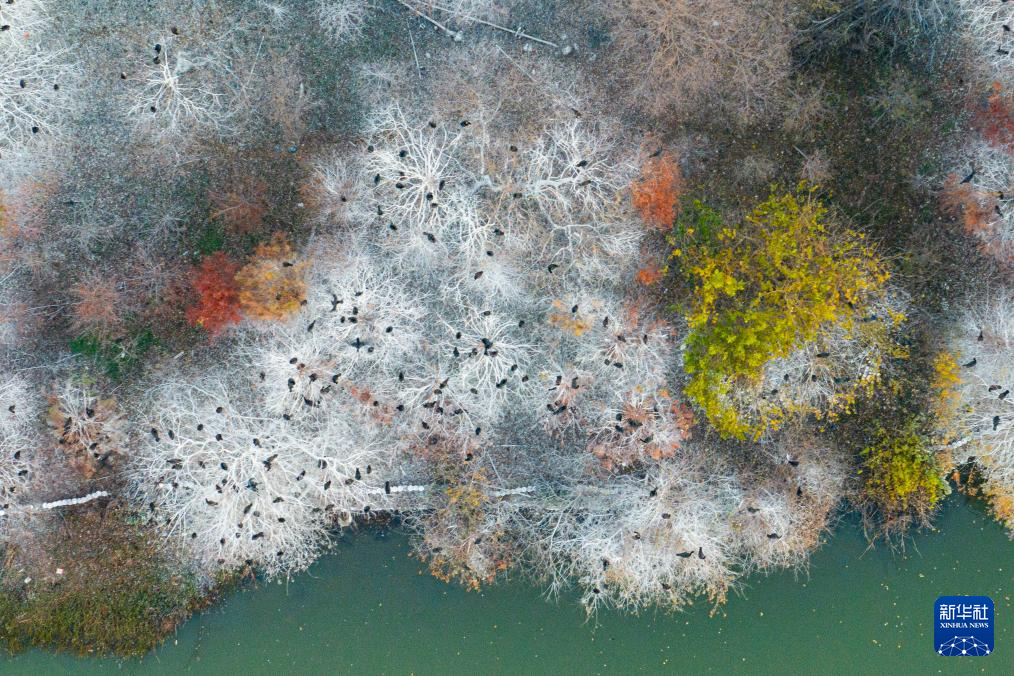 12月16日,鳥兒在武漢市東湖風(fēng)景區(qū)的樹上棲息(無人機(jī)照片)。