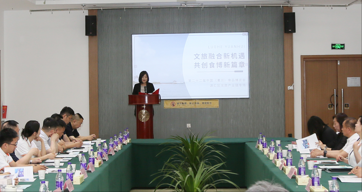 齊琳同志圍繞源匯區(qū)文旅產(chǎn)業(yè)發(fā)展現(xiàn)狀及優(yōu)勢作了專題宣傳推介,簡要介紹近年來源匯區(qū)堅(jiān)持“文化點(diǎn)亮城市、產(chǎn)業(yè)彰顯特色、創(chuàng)新引領(lǐng)未來”發(fā)展理念,立足“文商旅創(chuàng)融合中心區(qū)”發(fā)展定位,高起點(diǎn)站位、高標(biāo)準(zhǔn)謀劃、高質(zhì)量推進(jìn),做好文旅文創(chuàng)融合文章,積極培育文旅文創(chuàng)消費(fèi)新業(yè)態(tài)新場景,全力推動(dòng)文旅產(chǎn)業(yè)鏈項(xiàng)目建設(shè),走出一條以文化人、以文興業(yè)的新路子。最后表示將以此次食博盛會(huì)為契機(jī),以文旅融合為抓手,以食品文化為貫穿,依托轄區(qū)河上街景區(qū)和漯灣古鎮(zhèn)超高人氣和特色資源優(yōu)勢,持續(xù)豐富旅游產(chǎn)品和旅游供給,激發(fā)消費(fèi)潛力,提升文化能級(jí),擦亮文商旅創(chuàng)融合新名片,傾力將源匯區(qū)打造成“在者舒心、來者傾心、聞?wù)邉?dòng)心”的全國知名文化旅游目的地。